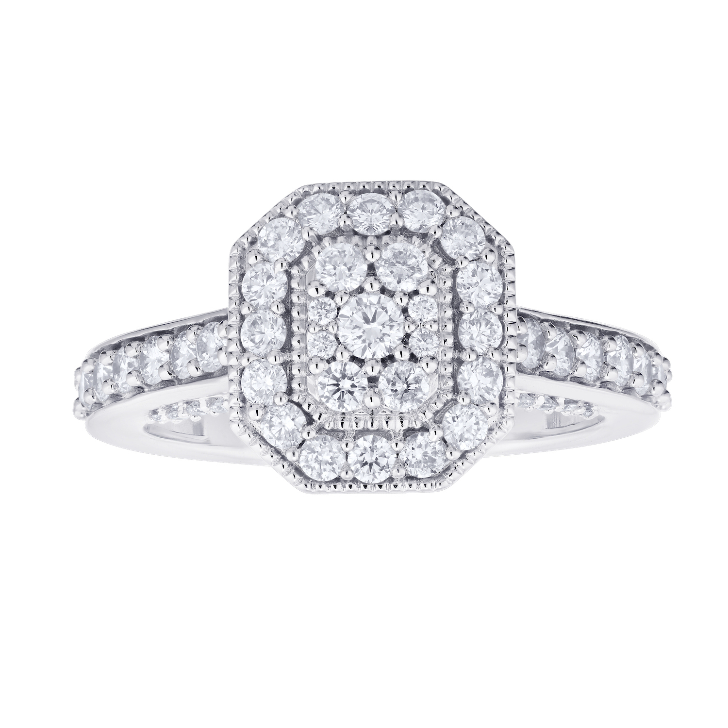 Smaller diamonds are artistically set together to create a magnificent design that looks like one single stone. This 14kw White Gold Ring will be a stunning addition to any jewelry collection.