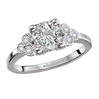 This is a beautiful 14kt yellow gold semi-mount engagement ring with diamonds adorning either side of a setting that will accommodate a 6.5mm round diamond. (D 1/7 carat total weight)