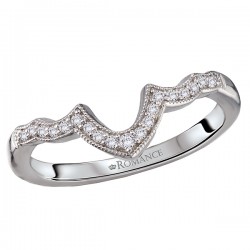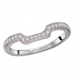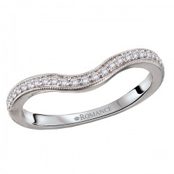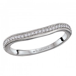 14kt white gold wedding band with round diamonds and milgrain detail along a curved front. (D 1/6 carat total weight)