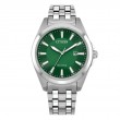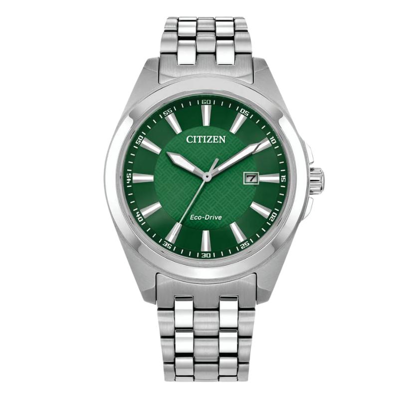 Make a distinctive style statement. Featuring a silver-tone stainless steel case and a green 3-hand dial encased in sapphire crystal, this men's timepiece is a combination of functional simplicity with a touch of elegance. The silver-tone stainless-steel bracelet has a fold over clasp with push buttons, giving the watch an understated refinement. Water resistant to 100 meters and sustainably powered by any light with Eco-Drive that never needs a battery.