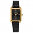 Smooth lines and subtle sophistication define the Dress Classic collection, with this latest addition to the series once again showcasing its timeless style. A 23.5mm case with curved lugs centers the chic design, with the yellow gold-tone stainless steel warmly contrasting against the black of the textured leather strap and the synthetic sapphire-set crown. A black, minimalist dial presents the time in elegant fashion. This refined watch utilizes our proprietary Eco-Drive technology that's sustainably powered by any light-meaning it never needs a battery. Water resistant up to 30 meters. Caliber E031.