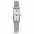 Measuring 14.3 by 30.7mm, the elongated silver-tone stainless steel case is set apart by angled lugs, a raised mineral crystal, and a crown accented with a subtle blue cabochon. A matching stainless steel bracelet adds to the watch's jewelry-like presence. On the silver sunray dial, deep blue accents highlight the applied indices and slender, sword-style hands, offering a sophisticated contrast that ensures clarity and style in equal measure. Water resistant up to 30 meters. Caliber G620.