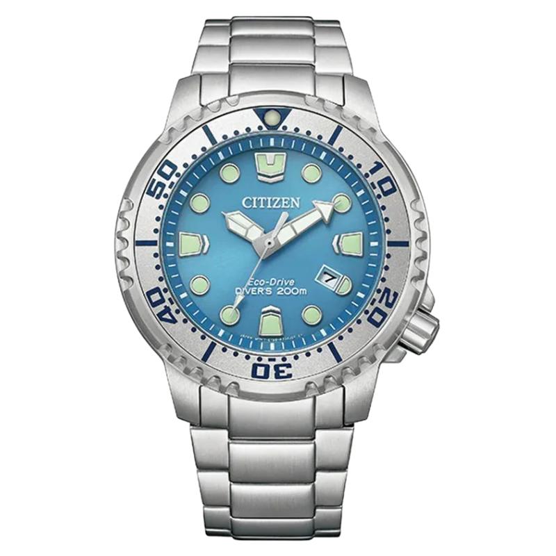 Submerge yourself in the latest Dive watch to join Citizen's innovative Promaster line. The robust 44mm silver-tone stainless steel exterior has an easy-grip dive bezel and crown at 4 o'clock, with the monochromatic design secured to the wrist via a matching silver-tone stainless steel bracelet. The sunray-textured, light blue dial features oversized hands and applied markers that add to its high legibility, while accents of a bright luminous material ensure high legibility to even the deepest depths. At the 4 o'clock position is a thoughtful date window, adding another element of functionality to this built-tough diver. Maintaining the robust standards of the Promaster Collection, the timepiece is water resistant up to 200 meters. Powered by Citizen's proprietary Eco-Drive technology to provide light-powered vitality continuously and sustainably without ever needing a battery. Caliber E168.