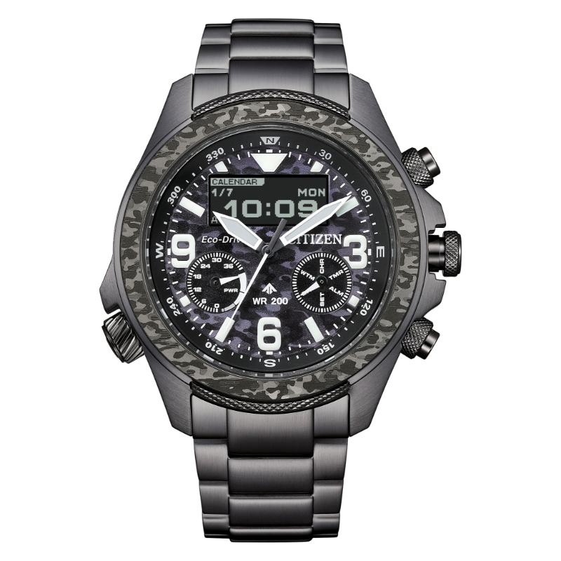 From its bold case inward, the watch is ready for action, featuring a 43.9mm stainless steel case with a gray IP coating and camo accents for durability that goes the distance. On the dial, luminous hands and markers stand out on a camo black background for high legibility, while a combination of digital and analog details ensures mission-ready wear. Two right-side pushers and an 8 o'clock crown to move the watch's compass scale help the user operate Promaster's high-performance function on the display, which includes a world time, chronograph, alarm, light level indicator, perpetual calendar, power save mode, charge level display, and summertime display. The limited edition Promaster is sustainably powered by any light with our proprietary Eco-Drive technology, so it never needs a battery. This high-performance watch comes with an interchangeable camo strap and an exclusive gray tackle box. Water resistant to 200 meters. Caliber U822.